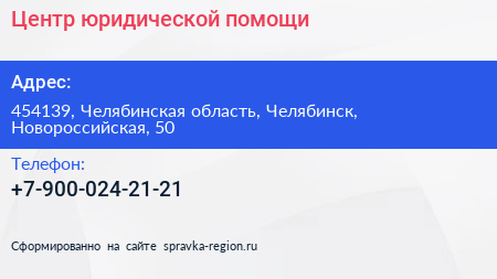 Центр юридической помощи по адресу 454139, Челябинская область, Челябинск, Новороссийская, 50 в дальнейшем Организация, размещена в следующих категориях:
