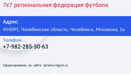 7х7, региональная федерация футбола по адресу 454091, Челябинская область, Челябинск, Монакова, 1а в дальнейшем Организация, размещена в следующих категориях: