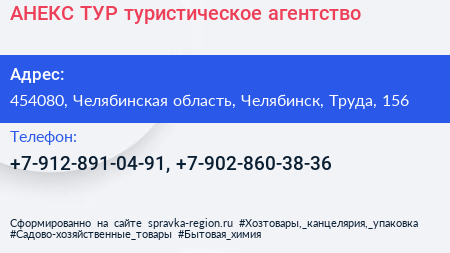 АНЕКС ТУР, туристическое агентство по адресу 454080, Челябинская область, Челябинск, Труда, 156 в дальнейшем Организация, размещена в следующих категориях: