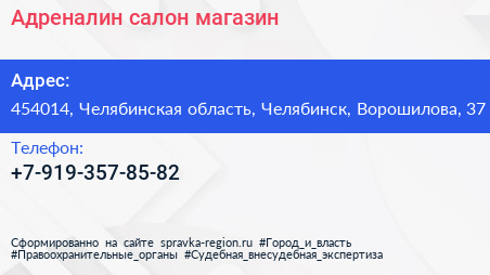 Адреналин, салон-магазин по адресу 454014, Челябинская область, Челябинск, Ворошилова, 37 в дальнейшем Организация, размещена в следующих категориях: