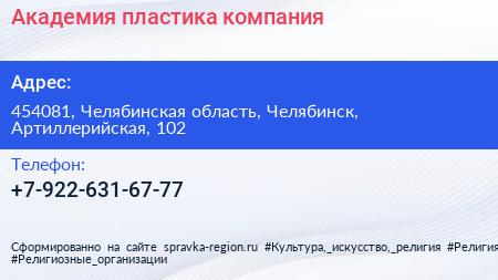 Академия пластика, компания по адресу 454081, Челябинская область, Челябинск, Артиллерийская, 102 в дальнейшем Организация, размещена в следующих категориях: