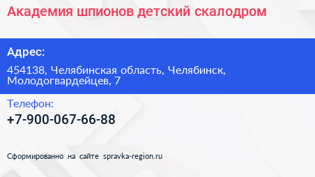 Академия шпионов, детский скалодром по адресу 454138, Челябинская область, Челябинск, Молодогвардейцев, 7 в дальнейшем Организация, размещена в следующих категориях: