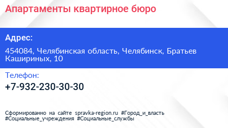 Апартаменты, квартирное бюро по адресу 454084, Челябинская область, Челябинск, Братьев Кашириных, 10 в дальнейшем Организация, размещена в следующих категориях: