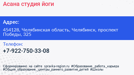 Асана, студия йоги по адресу 454128, Челябинская область, Челябинск, проспект Победы, 325 в дальнейшем Организация, размещена в следующих категориях: