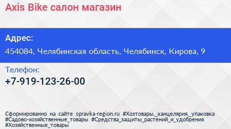 Axis-Bike, салон-магазин по адресу 454084, Челябинская область, Челябинск, Кирова, 9 в дальнейшем Организация, размещена в следующих категориях: