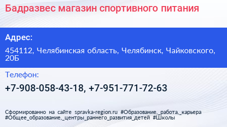 Бадразвес, магазин спортивного питания по адресу 454112, Челябинская область, Челябинск, Чайковского, 20Б в дальнейшем Организация, размещена в следующих категориях: