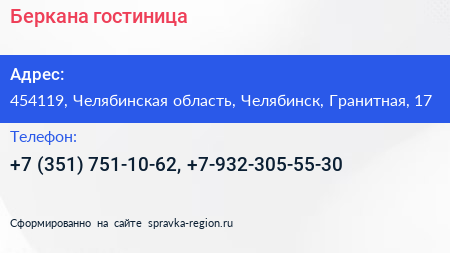 Беркана, гостиница по адресу 454119, Челябинская область, Челябинск, Гранитная, 17 в дальнейшем Организация, размещена в следующих категориях: