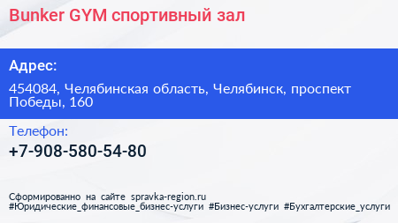 Bunker GYM, спортивный зал по адресу 454084, Челябинская область, Челябинск, проспект Победы, 160 в дальнейшем Организация, размещена в следующих категориях: