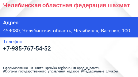 Челябинская областная федерация шахмат по адресу 454080, Челябинская область, Челябинск, Васенко, 100 в дальнейшем Организация, размещена в следующих категориях:
