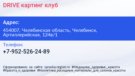 DRIVE, картинг-клуб по адресу 454007, Челябинская область, Челябинск, Артиллерийская, 124в/1 в дальнейшем Организация, размещена в следующих категориях: