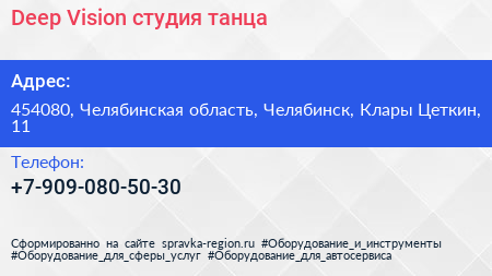 Deep Vision, студия танца по адресу 454080, Челябинская область, Челябинск, Клары Цеткин, 11 в дальнейшем Организация, размещена в следующих категориях: