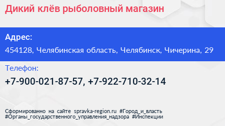 Дикий клёв, рыболовный магазин по адресу 454128, Челябинская область, Челябинск, Чичерина, 29 в дальнейшем Организация, размещена в следующих категориях: