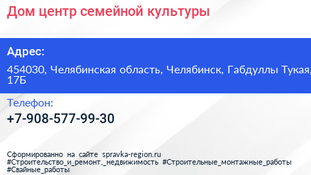 Дом, центр семейной культуры по адресу 454030, Челябинская область, Челябинск, Габдуллы Тукая, 17Б в дальнейшем Организация, размещена в следующих категориях: