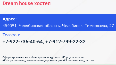 Dream house, хостел по адресу 454091, Челябинская область, Челябинск, Тимирязева, 27 в дальнейшем Организация, размещена в следующих категориях: