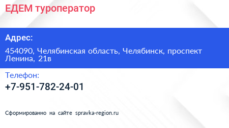 ЕДЕМ, туроператор по адресу 454090, Челябинская область, Челябинск, проспект Ленина, 21в в дальнейшем Организация, размещена в следующих категориях: