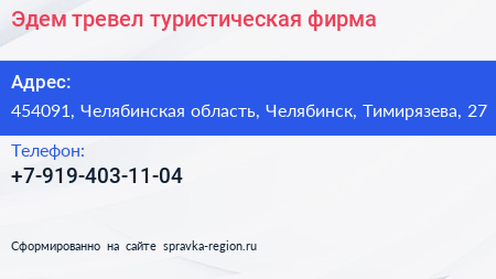 Эдем тревел, туристическая фирма по адресу 454091, Челябинская область, Челябинск, Тимирязева, 27 в дальнейшем Организация, размещена в следующих категориях: