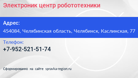 Электроник, центр робототехники по адресу 454084, Челябинская область, Челябинск, Каслинская, 77 в дальнейшем Организация, размещена в следующих категориях: