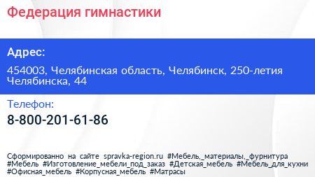 Федерация гимнастики по адресу 454003, Челябинская область, Челябинск, 250-летия Челябинска, 44 в дальнейшем Организация, размещена в следующих категориях: