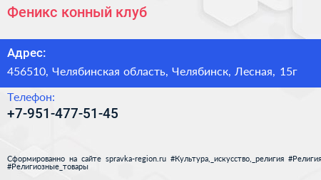 Феникс, конный клуб по адресу 456510, Челябинская область, Челябинск, Лесная, 15г в дальнейшем Организация, размещена в следующих категориях: