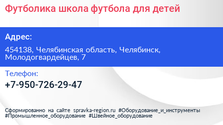 Футболика, школа футбола для детей по адресу 454138, Челябинская область, Челябинск, Молодогвардейцев, 7 в дальнейшем Организация, размещена в следующих категориях: