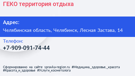 ГЕКО, территория отдыха по адресу Челябинская область, Челябинск, Лесная Застава, 14 в дальнейшем Организация, размещена в следующих категориях: