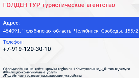 ГОЛДЕН ТУР, туристическое агентство по адресу 454091, Челябинская область, Челябинск, Свободы, 155/2 в дальнейшем Организация, размещена в следующих категориях: