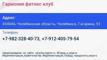 Гармония, фитнес-клуб по адресу 454046, Челябинская область, Челябинск, Гагарина, 51 в дальнейшем Организация, размещена в следующих категориях:
