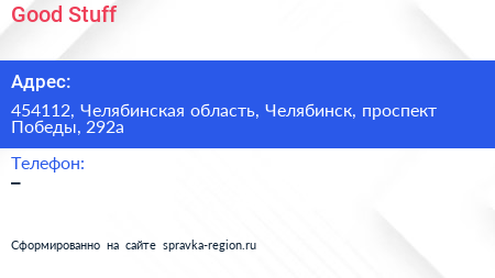 Good Stuff по адресу 454112, Челябинская область, Челябинск, проспект Победы, 292а в дальнейшем Организация, размещена в следующих категориях: