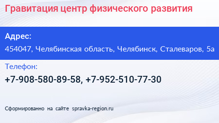 Гравитация, центр физического развития по адресу 454047, Челябинская область, Челябинск, Сталеваров, 5а в дальнейшем Организация, размещена в следующих категориях: