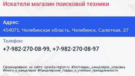 Искатели, магазин поисковой техники по адресу 454071, Челябинская область, Челябинск, Салютная, 27 в дальнейшем Организация, размещена в следующих категориях: