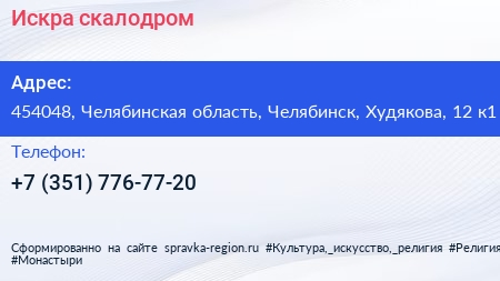 Искра, скалодром по адресу 454048, Челябинская область, Челябинск, Худякова, 12 к1 в дальнейшем Организация, размещена в следующих категориях: