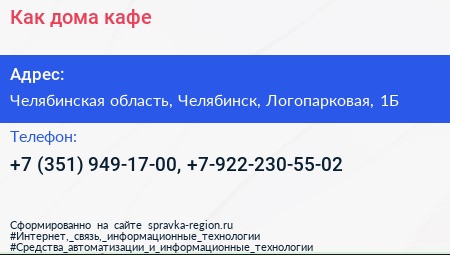Как дома, кафе по адресу Челябинская область, Челябинск, Логопарковая, 1Б в дальнейшем Организация, размещена в следующих категориях: