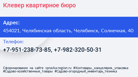 Клевер, квартирное бюро по адресу 454021, Челябинская область, Челябинск, Солнечная, 40 в дальнейшем Организация, размещена в следующих категориях: