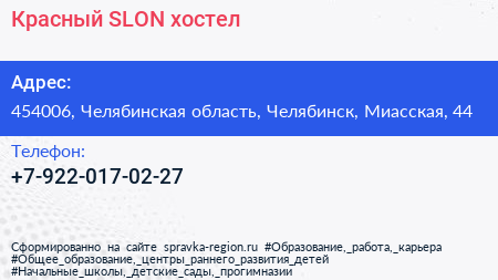 Красный SLON, хостел по адресу 454006, Челябинская область, Челябинск, Миасская, 44 в дальнейшем Организация, размещена в следующих категориях: