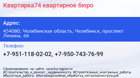 Квартирка74, квартирное бюро по адресу 454080, Челябинская область, Челябинск, проспект Ленина, 66 в дальнейшем Организация, размещена в следующих категориях: