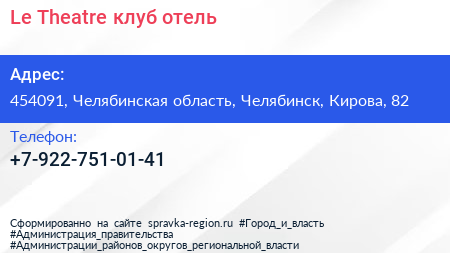 Le Theatre, клуб-отель по адресу 454091, Челябинская область, Челябинск, Кирова, 82 в дальнейшем Организация, размещена в следующих категориях: