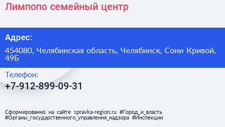 Лимпопо, семейный центр по адресу 454080, Челябинская область, Челябинск, Сони Кривой, 49Б в дальнейшем Организация, размещена в следующих категориях: