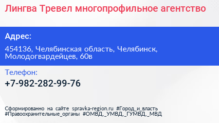 Лингва Тревел, многопрофильное агентство по адресу 454136, Челябинская область, Челябинск, Молодогвардейцев, 60в в дальнейшем Организация, размещена в следующих категориях: