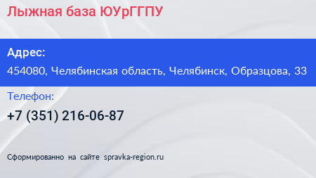 Лыжная база, ЮУрГГПУ по адресу 454080, Челябинская область, Челябинск, Образцова, 33 в дальнейшем Организация, размещена в следующих категориях: