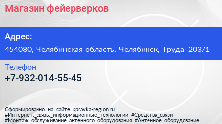 Магазин фейерверков по адресу 454080, Челябинская область, Челябинск, Труда, 203/1 в дальнейшем Организация, размещена в следующих категориях: