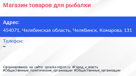 Магазин товаров для рыбалки по адресу 454071, Челябинская область, Челябинск, Комарова, 131 в дальнейшем Организация, размещена в следующих категориях: