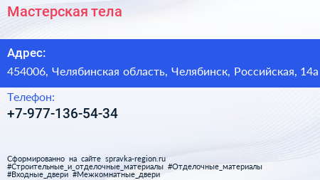 Мастерская тела по адресу 454006, Челябинская область, Челябинск, Российская, 14а в дальнейшем Организация, размещена в следующих категориях: