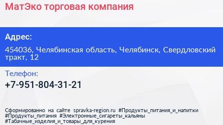 МатЭко, торговая компания по адресу 454036, Челябинская область, Челябинск, Свердловский тракт, 12 в дальнейшем Организация, размещена в следующих категориях: