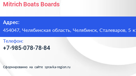 Mitrich Boats & Boards по адресу 454047, Челябинская область, Челябинск, Сталеваров, 5 к1 в дальнейшем Организация, размещена в следующих категориях: