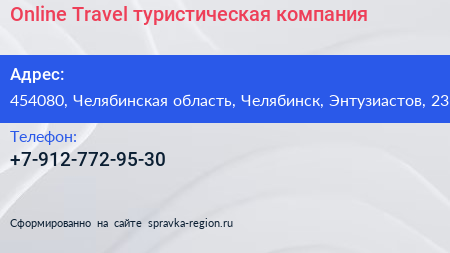 Online Travel, туристическая компания по адресу 454080, Челябинская область, Челябинск, Энтузиастов, 23 в дальнейшем Организация, размещена в следующих категориях: