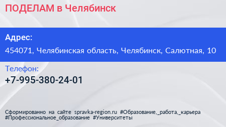 ПОДЕЛАМ в Челябинск по адресу 454071, Челябинская область, Челябинск, Салютная, 10 в дальнейшем Организация, размещена в следующих категориях: