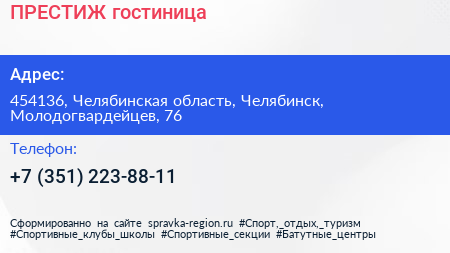 ПРЕСТИЖ, гостиница по адресу 454136, Челябинская область, Челябинск, Молодогвардейцев, 76 в дальнейшем Организация, размещена в следующих категориях: