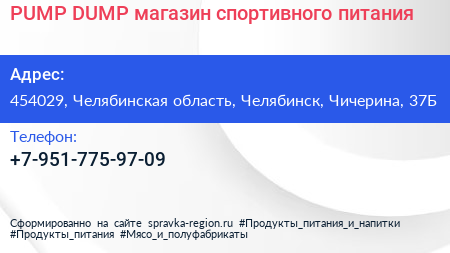 PUMP & DUMP, магазин спортивного питания по адресу 454029, Челябинская область, Челябинск, Чичерина, 37Б в дальнейшем Организация, размещена в следующих категориях:
