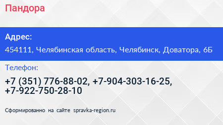 Пандора по адресу 454111, Челябинская область, Челябинск, Доватора, 6Б в дальнейшем Организация, размещена в следующих категориях: