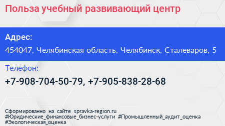 Польза, учебный развивающий центр по адресу 454047, Челябинская область, Челябинск, Сталеваров, 5 в дальнейшем Организация, размещена в следующих категориях: